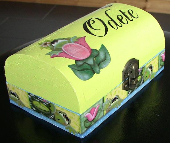 A pink and orange keepsake box specially decorated to Ema.